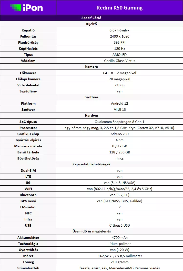 A Redmi K50 Gaming elérhető lesz globálisan, de egyelőre csak a kínai bevezetésről esett szó. A márka hazájában már a napokban forgalomba kerül az okostelefon. A 8/128 GB-os modellért 3300 jüant (163 ezer forint) kell kifizetni, a 12/128 GB-os variáns 3600 jüant (178 ezer forint) kóstál majd, a 12/256 GB-tal szerelt eszköz pedig 3900 jüanba (193 ezer forint) kerül majd. A Mercedes mintás különkiadásra pedig 4100 jüant (203 ezer forint) kell majd szánni, ez is 12/256 GB-os egyébként.