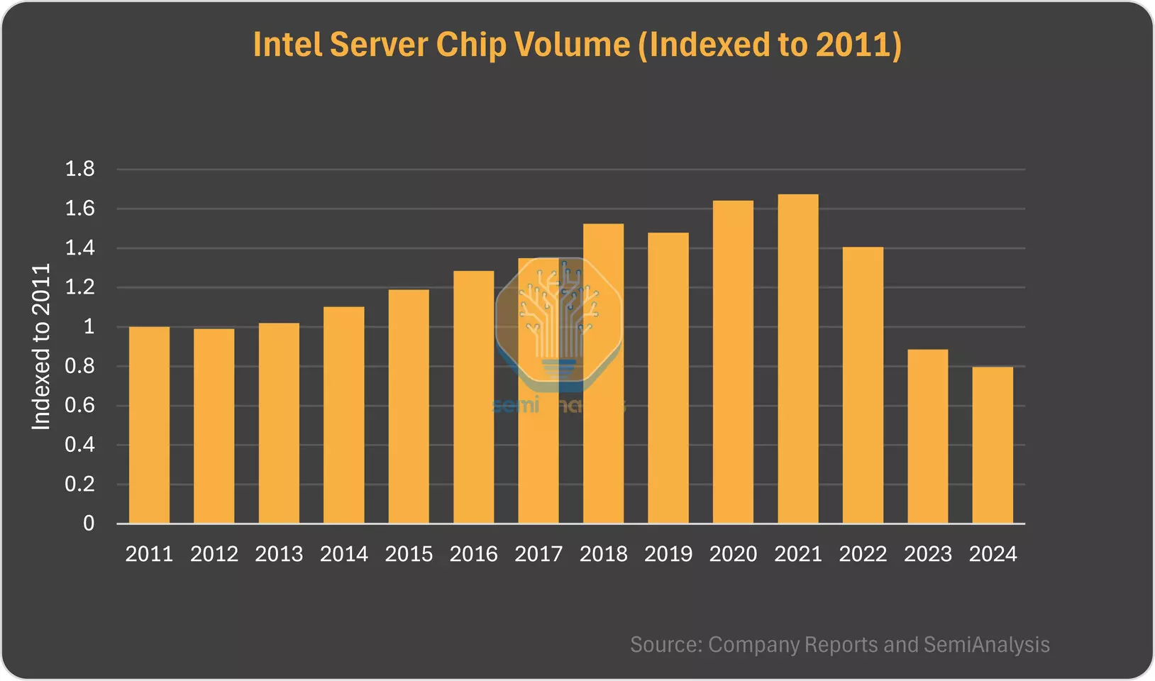 Az AMD-nél tehát jól fut a szekér az adatközpontok szegmensében, főként a processzorok terén, ám az Intel esetében már nem mondható el ugyanet. A legfrissebb elemzés alapján, ami Sravan Kundojjala, a SmiAnalysis elemzőjének tollából származik, úgy tűnik, az Intel Xeon processzorainak szállítási mutatója 13 éves mélypontra került, ami semmiképpen sem jó hír a vállalat számára. Az elemző az eddigi éves adatokat egy diagramba foglalta egészen 2011-ig visszamenőleg, ez alapján remekül látszik, eléggé komoly csökkenést szenvedett el a Xeon processzorok szállítási mutatója az elmúlt néhány év folyamán.