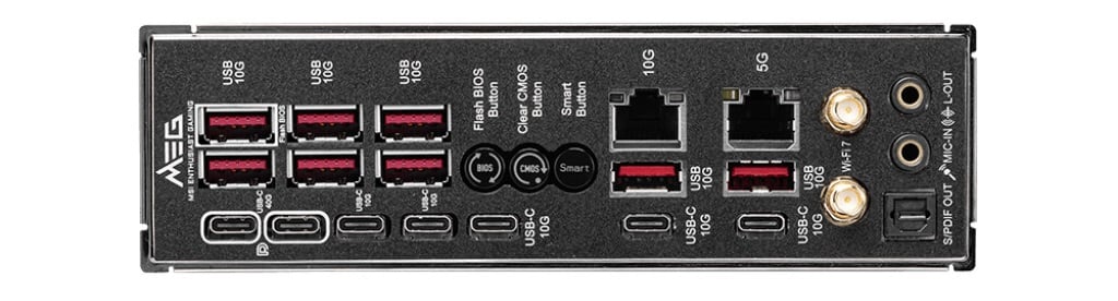 A bővítőkártyákat két PCI Express x16-os, illetve egy PCI Express x4-es slot várja, míg M.2-es bővítőhelyekből összesen 7 darab jár. Utóbbiak közül ötöt alaplapi bővítőhelyek formájában érhetünk el, míg a fennmaradó kettőt az M.2 XPANDER-Z Slider Gen5 bővítőkártya fedélzetén találunk, amelyekhez a hátoldal felől, a gépház kinyitása nélkül is hozzáférhetünk. A kínálat részét képezi még egy Realtek ALC4082-es kodek is, amihez ESS9212Q típusú Combo DAC/HPA jár, míg a vezetékes kommunikációt egy 10 GbE és egy 5GbE port biztosítja – előbbi egy Marvell, utóbbi egy Realtek vezérlőt használ. Kapunk még Wi-Fi 7 és Bluetooth 5.4 támogatást is, plusz a 3,99 hüvelykes képátlójú Dynamic Dashboard III kijelző sem hiányzik a fedélzetről, ami sok hasznos információ megjelenítésére képes. Az új alaplapon találunk két darab 40 Gbps-os USB4-es, valamint 13 darab 10 Gbps-os USB 3.2-es portot is – utóbbiak közül 8 Type-A, 5 pedig Type-C kivitelben érkezik.