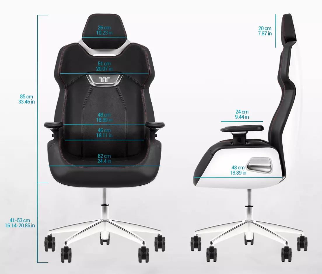 A háttámla négy dőlésszöget támogat, így 107 fokban, 113 fokban, 119 fokban és 126 fokban megdöntve egyaránt rögzíthető a kényelmesebb ülőpozíció elérésének érdekében. A kartámla előre és hátra állítható, valamint a magasságát is testreszabhatjuk, és igény esetén oldalirányban is állítható, sőt nagyjából 45 fokban még kifelé is fordíthatjuk az elejét. Ezzel együtt a fejtámla is állítható, már ami a magasságát illeti. A szék még polírozott alumínium Thermaltake logót is kapott.