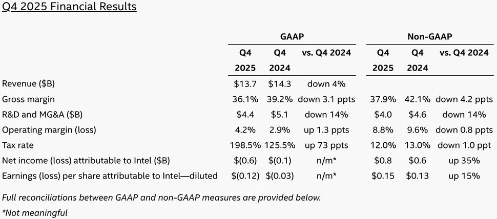 Az Intel Foundry részleg a negyedik negyedévben 4,5 milliárd dolláros teljes árbevételt termelt, azaz negyedéves szinten 6,4%-os növekedést produkált, ami annak köszönhető, hogy az Intel 3 alapú Xeon 6 processzorok, illetve az Intel 4 alapú Arrow Lake processzorok szállítási mutatói nőttek, valamint a Panther Lake korai szilícium-ostyái is hozzájárultak a növekedéshez. Az EUV alapú gyártástechnológiák a gyártó szerint most már 10% feletti mértékben járulnak hozzá az Intel Foundry teljes árbevételéhez, míg 20243 folyamán még 1% alatti volt ez az érték. Az elmúlt negyedévben 2,5 milliárd dolláros veszteséget termelt ez a részleg, ami részben a 18A termelés felfuttatásának, részben pedig a kapacitás bővítésével kapcsolatos befektetéseknek köszönhető.