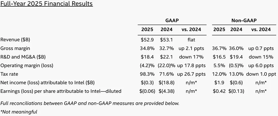 A vállalatnak sem a negyedik negyedévben, sem a teljes pénzügyi év folyamán nem sikerült teljesen megszabadulnia a veszteségektől, igaz a 2024-re vonatkozó 18,8 milliárd dolláros veszteség helyett 2025-ben már csak 300 millió dolláros veszteség szerepel a mérlegben, de ez nagyban köszönhető annak, hogy óriási tőkeinjekciót kapott a vállalat. Az elmúlt év folyamán az amerikai kormányzat 8,9 milliárd dollárt fizetett 9,9%-os tulajdonrészért cserébe, valamint a SoftBank is beszállt 2 milliárd dollárnyi befektetéssel, plusz az Altera 51%-os tulajdonrészét is értékesítették 4,46 milliárd dollárért, és végül az Nvidia is bevásárolt 5 milliárd dollár értékben. Ha ezek az összegek nem érkeztek volna be, 300 millió dollárnál jóval nagyobb lett volna a veszteség mértéke a teljes évre vetítve.