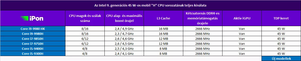 A vállalat az új asztali processzorok mellett hat új 9. generációs Core sorozatú mobil processzorral is előrukkolt, amelyek mindannyian 45 W-os TDP kerettel rendelkeznek, hiszen "H" sorozatú megoldásokról van szó. A Core i9-es modelleknél ebben az esetben is elérhető a fentebb már említett Intel Thermal Velocity Boost funkció, ami a maximális Turbo Boost órajelet 100 MHz-cel segít kitolni. Azt a vállalat nem részletezte, hogy ennek engedélyezéséhez pontosan milyen feltételeknek kell megfelelnie az adott rendszernek, de minden bizonnyal arról van szó, hogy megfelelő teljesítményű hűtésre van szükség az üzemmód aktiválásához.