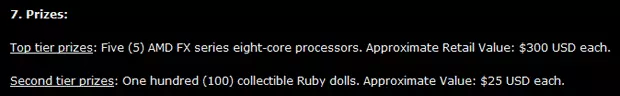 Az információ úgy szivárgott ki, hogy az AMD egy nyereményjáték keretén belül sorsol majd ki öt darab nyolcmagos, FX sorozatú központi egységet, plusz 100 darab Ruby babát, de a vállalat illetékesei elkövették azt a "hibát", hogy elárulták a nyeremények hozzávetőleges értékét. Az említett információkat a nyereményjáték szabályzatában találjuk, ahogy az a lenti képen is látszik.