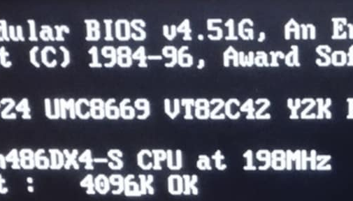 Hogy mi? 198MHz? Az alaplaphoz nem kaptam útmutatót, és valószínűleg a többféle, csak revízióban (néha még abban sem(!) ) különböző változatban eltérőek jumper beállítások. Esetünkben valahogy 66MHz-es FSB-vel és 3x-os szorzóval próbálta meghajtani a 100MHz-es processzort, mely ezt a bootképernyő megjelenítéséig tolerálta, már ez is egy kisebb csoda véleményem szerint. Egyrészt az, hogy egyáltalán elindult közel 100%-os túlhajtással, másrészt az, hogy egy 486-os alaplap 66MHz-es FSB-vel indul (az alaplap időközben megtalált leírása maximum 40MHz-et ír egyébként).