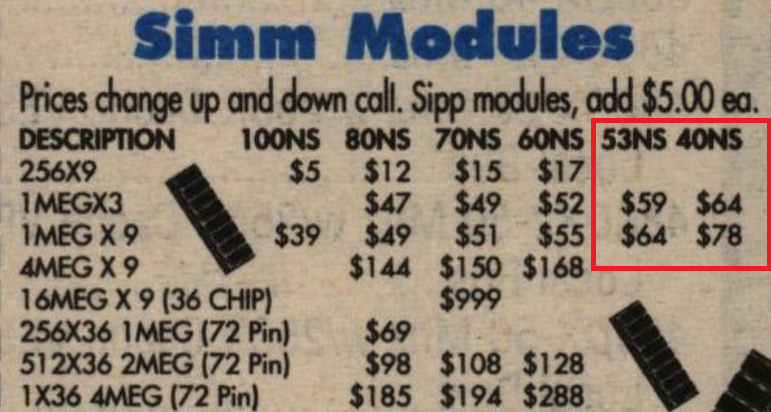 - A memória kiválasztásánál, ekkor a 70 nanoszekundumos chipek már elérhetőek voltak, már 60-as sebességűek is fel-fel tűntek sőt néha még gyorsabbak is (persze aranyáron), de bőven találkozhattunk még 80ns, vagy akár 100ns-es modulokkal. Ilyen esetekben fontos, hogy az FSB-nek megfelelő várakozási ciklusokat beállítsuk a BIOS setupban.