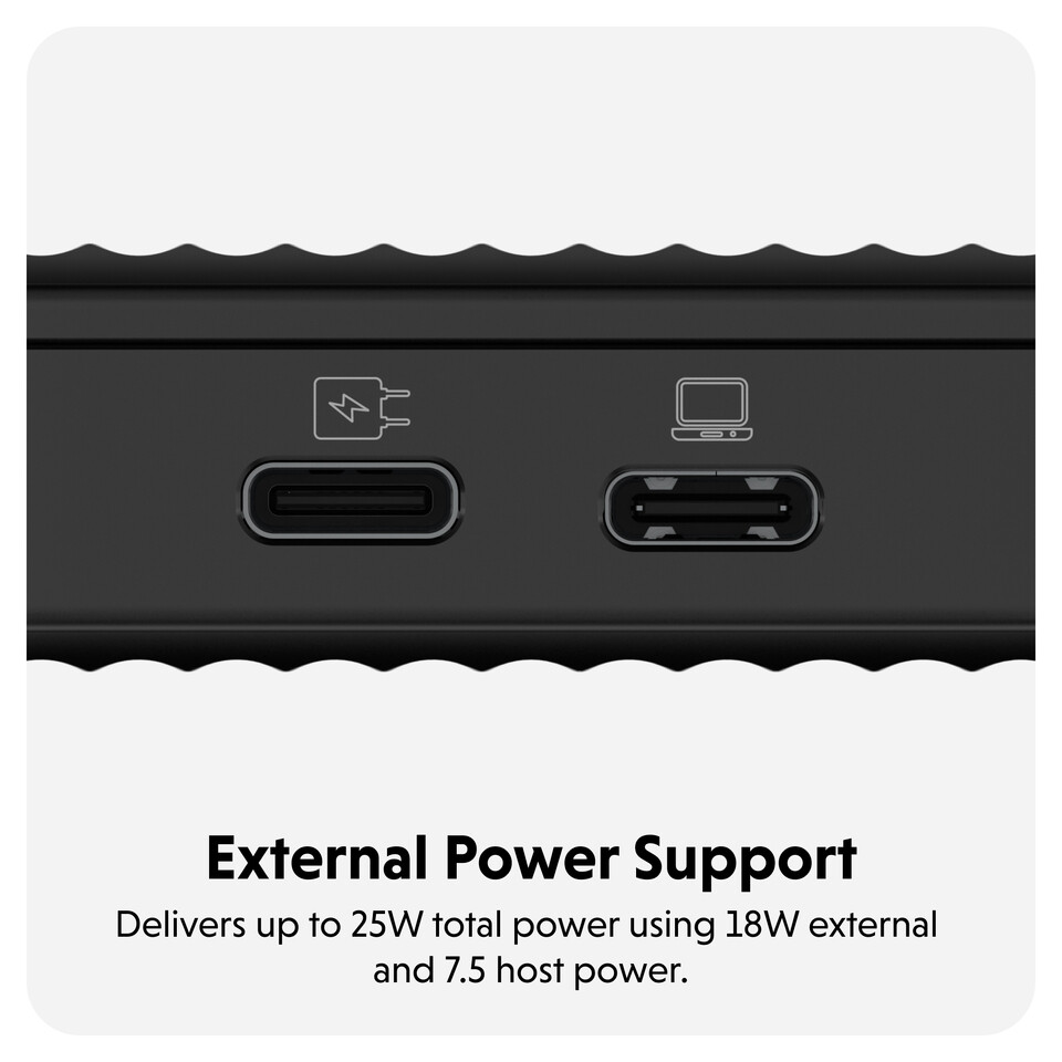 Az USB-C porton keresztül maximum 7,5 W-nyi teljesítmény felvételére képes az eszköz, de külső tápellátás is csatlakozhat hozzá, ami további 18 W-nyi teljesítményt tesz elérhetővé, így összesen akár 25 W-nyi teljesítménnyel is gazdálkodhat az adott SSD kártya – ezáltal a nagyobb teljesítményű, nagyobb étvágyú példányok használatára is lehetőség van.