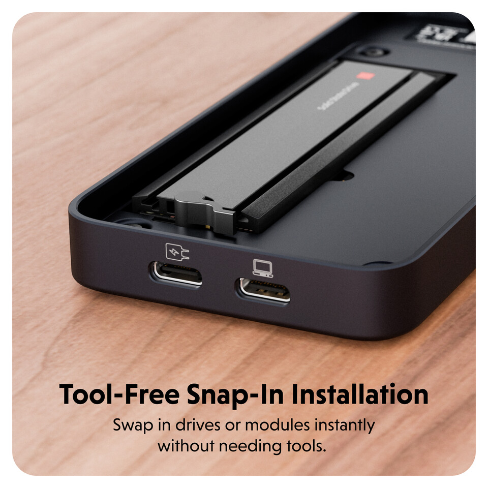 Az SSD kártya beszerelése szerszámok nélkül történhet: a háza egyszerűen ki lehet nyitni, az SSD kártya behelyezése sem bonyolult, és a rögzítéshez sem kell plusz eszközt használni – szinte pillanatok alatt letudható a folyamat. Az IP55-ös védelemről a mellékelt szilikontok gondoskodik, ami a párával és a fröccsenő vízzel, valamint a porral szemben egyaránt ellenállóvá teszi a terméket, így azt terepen is biztonságosan lehet használni.