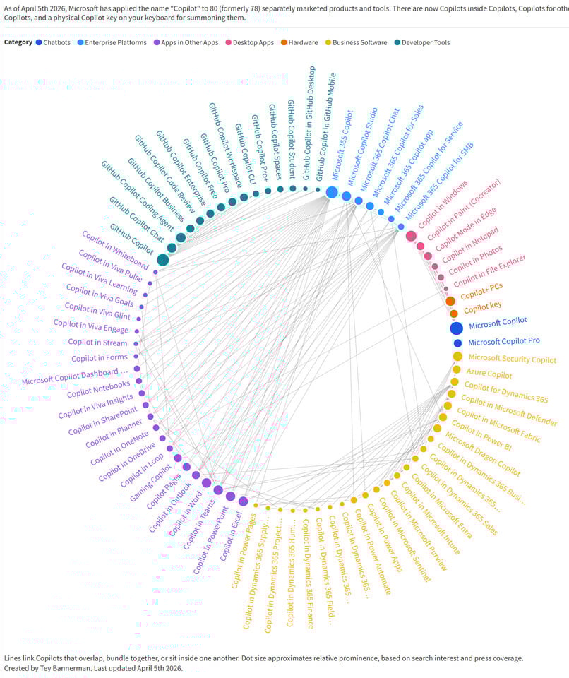A Copilot széles körben ismert a chatbot funkcionalitásról, de a Copilot+ PC kategória sem ismeretlen a felhasználók számára, illetve Copilot gomb is került már a modern billentyűzetekre. Ezeken felül számos szolgáltatásba integrálták a Copilot funkciót, így jelenleg összesen 80 olyan alkalmazás, termék, szolgáltatás, illetve hardver áll rendelkezésre, amelyek valamilyen szinten kapcsolódnak a Microsoft AI törekvéseinek központi szereplőjeként számon tartott Copilothoz. Erre Tey Bennerman mutatott rá a minap, aki vette a fáradtságot és összesítette, pontosan mennyi területen van jelen a Copilot.