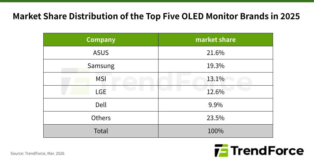 Az ötödik helyen a Dell található 9,9%-os piaci részesedéssel, amit az Alienware sorozatú OLED gamer monitorok révén érhetett el. A magas termékmegbízhatóság és az értékesítés utáni szolgáltatások révén hatékonyan szólította meg a gyártó a felsőkategóriás OLED gamer monitorok szegmensét, de ezzel egy időben 2025 folyamán olyan 120 Hz-es OLED monitorokat is piacra dobott, amelyek nem a gamareket, hanem az átlagfelhasználókat vették célba, azaz több szegmensben is próbálta hatékonyan megvetni a lábát.