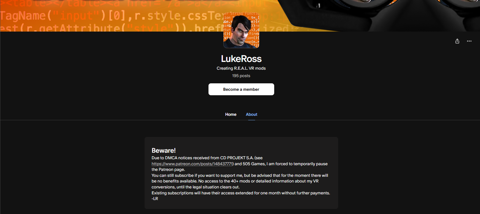 A történet viszont itt nem állt meg. A CD Projekt Red jogi akcióján ugyanis az 505 Games is felbátorodott, és ő is DMCA csapást mért a Patreon oldalára a Ghostrunner VR modja miatt. Luke Ross szerint a Patreon automatikusan elfogadja ezeket a követeléseket, de megérti ezt, hiszen a DMCA törvény lényegében végtelen jogot ad a nagy cégeknek arra, hogy atomot dobjanak bármire a levegőből, ami nem tetszik nekik.