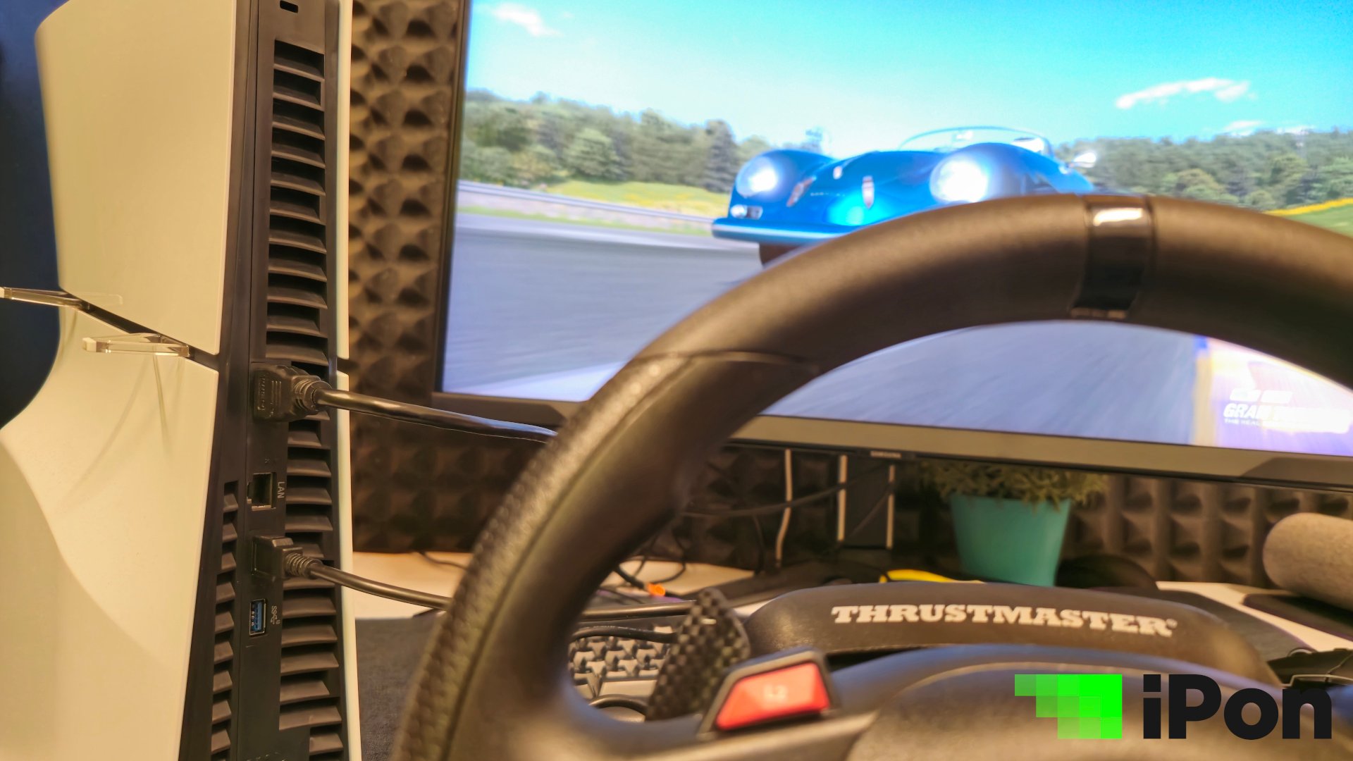 A kormány alapvetően PlayStation üzemmódban indult, amit az előlapi LED mélykék fénye is megerősített. Ehhez igazodva először egy PS5-ön próbáltam ki, és miután a Gran Turismo hajlandó volt letölteni és aktiválni a frissítést, már indulhattam is. Bár sajnos nem Type-C a kábel, találtam USB-A-t a konzol hátoldalán és a csatlakozás után máris megkaptam az irányítást. A navigáció pedig a menüben és a játékon belül is jól működött.