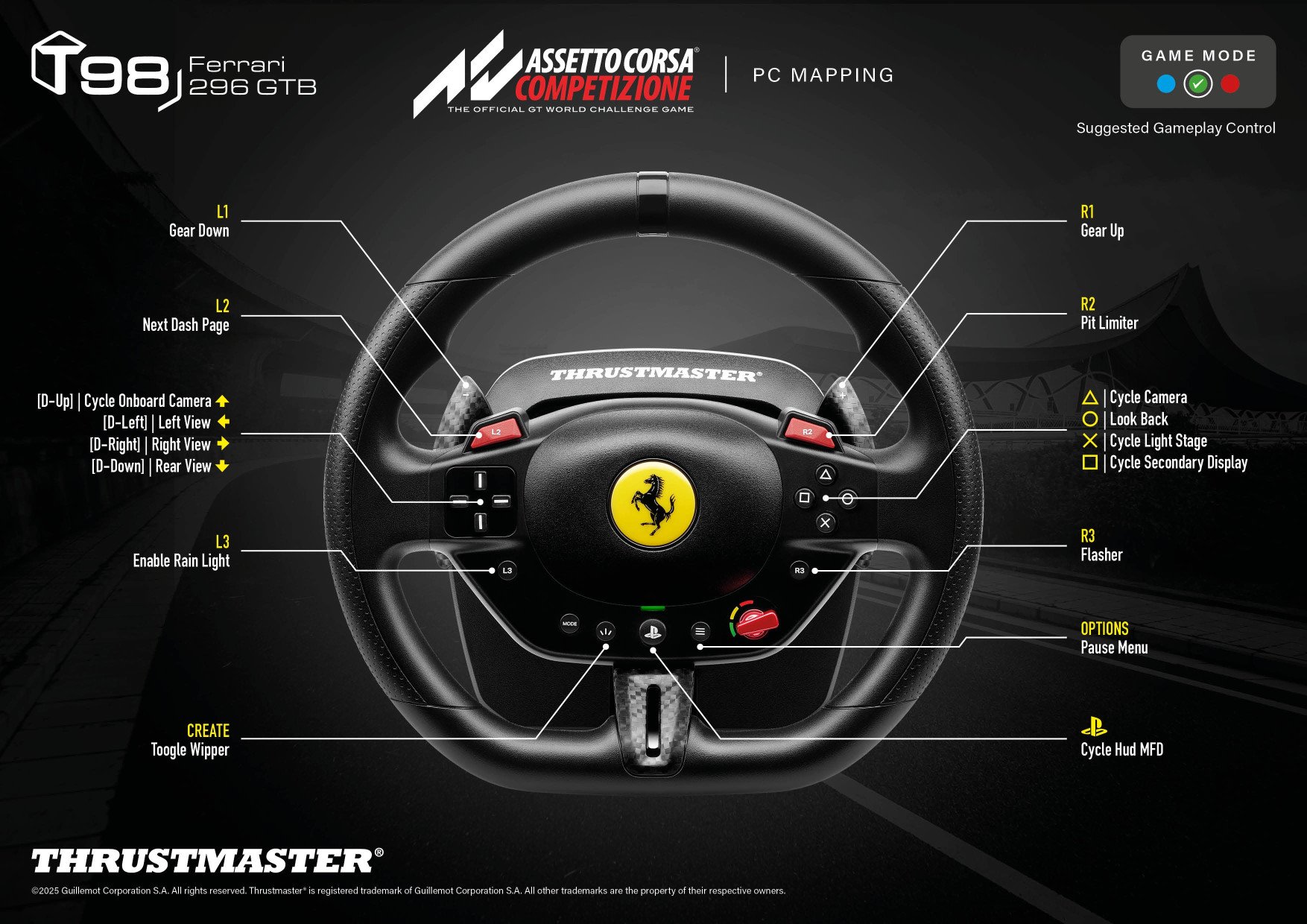 Összesen 16 fizikai gomb, egy háromállású kapcsoló és a két váltókar került a kormányra, ebből négy iránygomb a D-padet képviseli, megvannak a PlayStation kontrolleréről ismerős geometriai alakzatokkal jelölt funkciógombok, hozzájuk a vörös L2 és R2 gombok, ileltve az apró L3 és R3 gombok társulnak. Fontos szerepe van a Mode gombnak, amellyel a kompatibilitási módok között válthatunk, illetve van ablaktörlő gomb, menü és egy PlayStation gomb is.