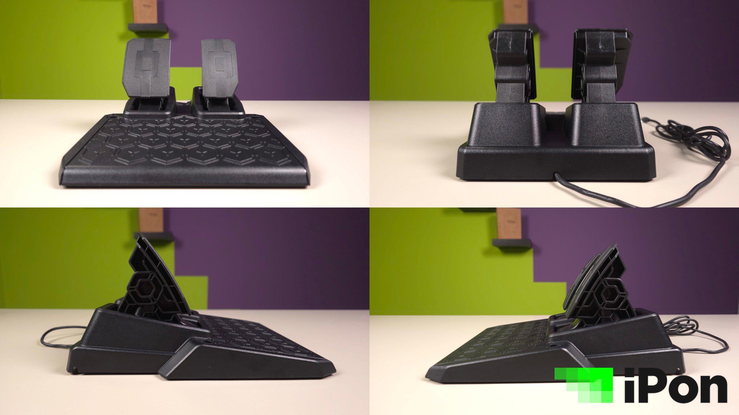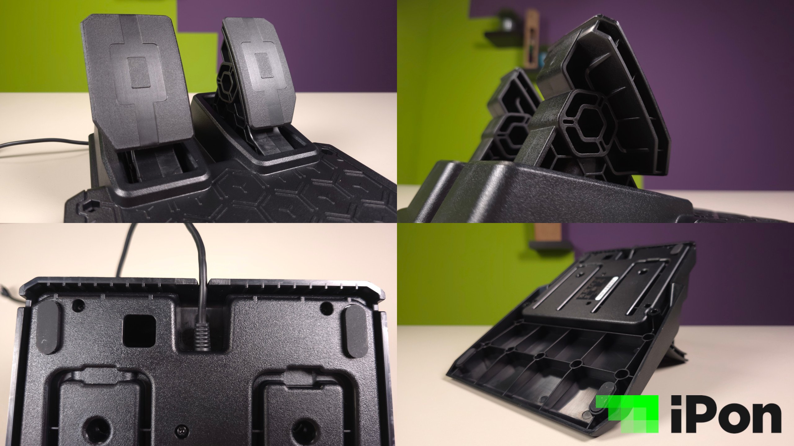 Ami a pedálokat illeti, 100% műanyag a két pedál ás a talp is. Ennél ha nem is meglepőbb, de kellemetlenebb felismerés, hogy sajnos trükközni kell majd vele, csúszósabb felületű padlón ugyanis röhögve elkorcsolyázik a lábunk alól. Nincsenek a szőnyegbe kapaszkodó fogacskák vagy egyértelmű rögzítőpontok, mondjuk meglepne, ha valaki ebből valóban szimulátorülést szeretne építeni.