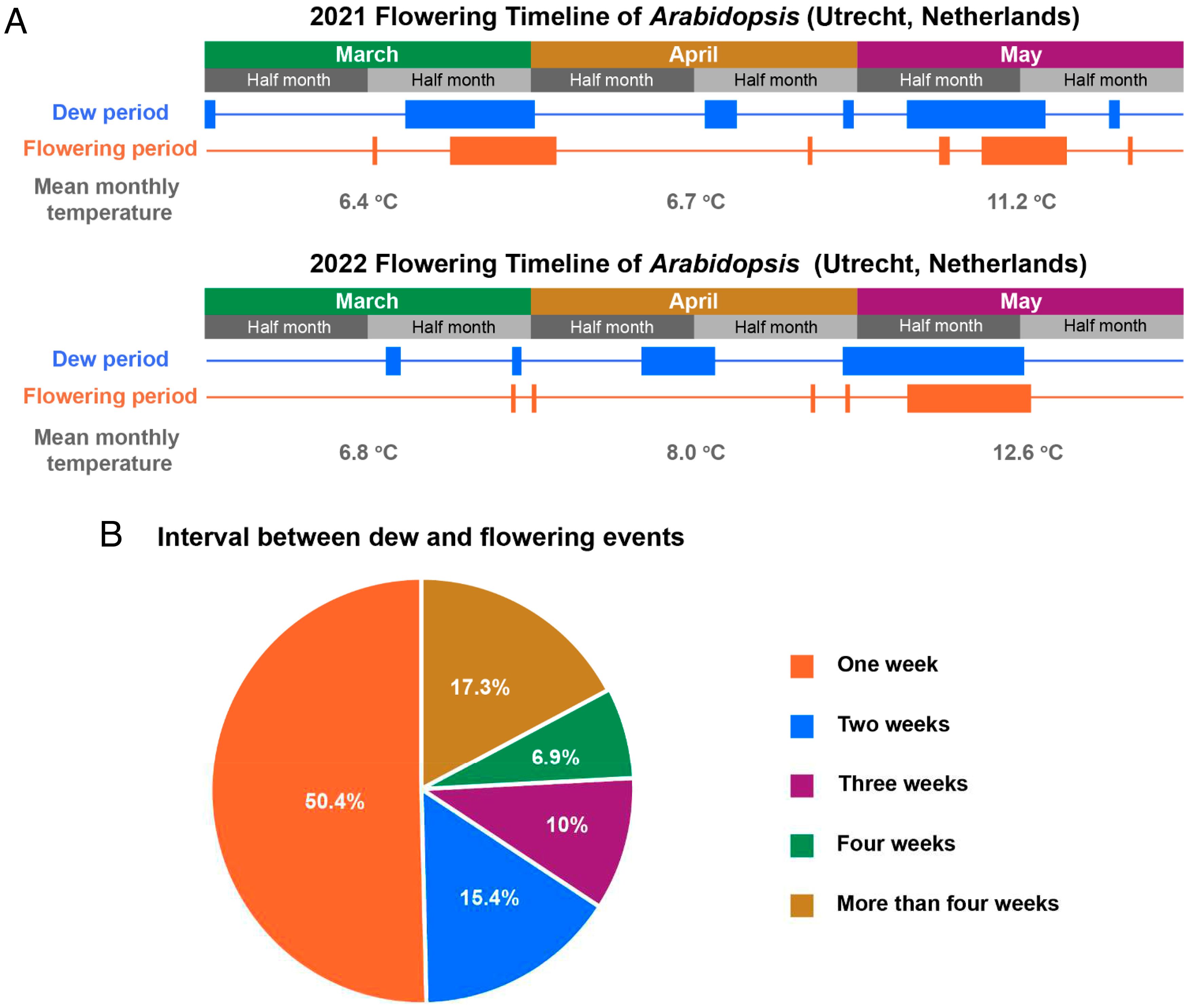 A kutatók 12 millió, 1990 és 2023 között gyűjtött virágzási időszakról szóló terepi adatot is elemeztek. Emellett 11 meteorológiai paramétert is analizáltak, és nemcsak a hőmérséklet és a nappalok hossza, hanem a harmatpont is szoros összefüggést mutatott a virágzási idővel. Összességében ezek az eredmények arra utalnak, hogy a harmatképződés egy eddig fel nem ismert kulcsfontosságú tényező a virágzás szempontjából, mondja Zare.