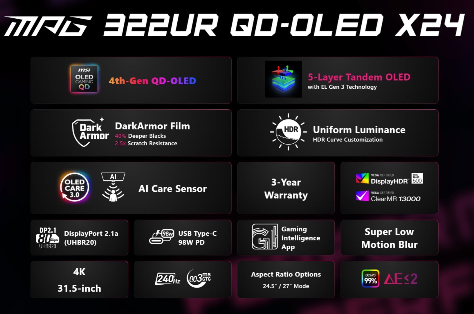 Az MPG 322UR X24-es modell alapját a Samsung QD-OLED Penta Tandem panelje adja, ami egy kvantumpontos OLED technológiára épülő, 5 rétegből álló megoldás. Az új panel hosszabb élettartammal és magasabb fényerősséggel ajándékozza meg a gamereket, ami jelen esetben azt eredményezi, hogy SDR módban ezúttal 300 nit fényerősségre számíthatunk, azaz 25%-kal magasabbra, mint amit az MPG 322URX esetében megszokhattunk, viszont a maximális HDR fényerősség nem változott, az továbbra is 1000 nites értéket képvisel. Változott viszont a monitor besorolása, ami az új panelnek köszönhető: a korábbi DisplayHDR True Black 400 tanúsítvány helyét a DisplayHDR True Black 500-as verzió vette át, valamint ClearMR 13000 tanúsítványt is kapott a friss gamer monitor.