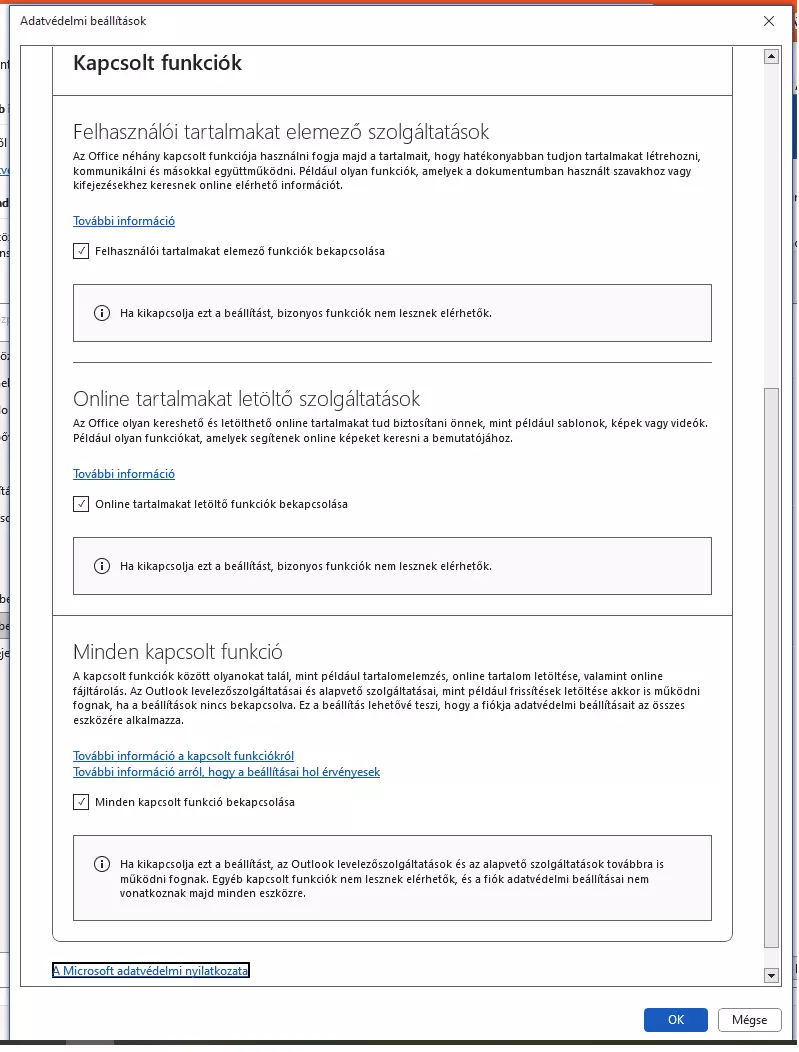 Az Office 2019 Word alkalmazásánál ebben a menüben az olvasható, hogy a szolgáltatás elemzi a felhasználói tartalmakat, ami nem biztos, hogy mindenki számára elfogadható, így aki úgy gondolja, ezt nem kéri, kapcsolja ki a szolgáltatást. Ettől persze még nem biztos, hogy megszabadulunk a tartalomelemző funkcióktól...