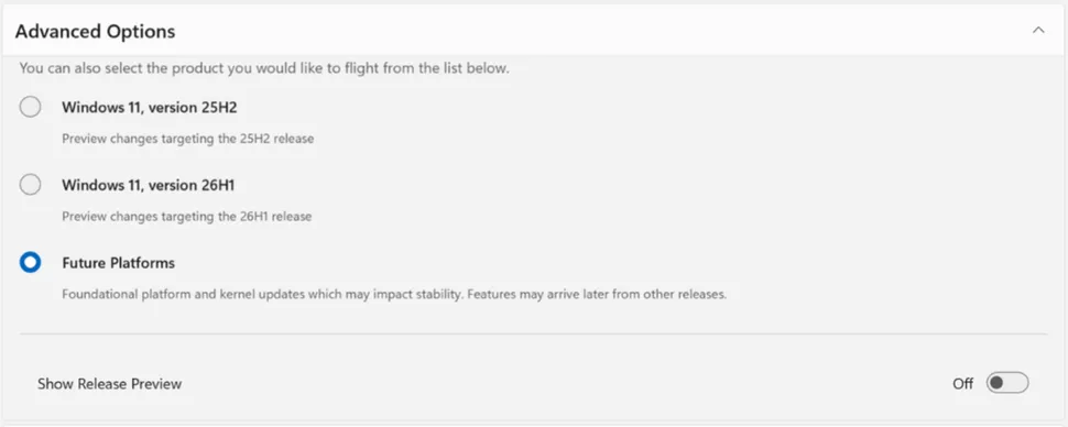 Az aktuális „Canary channel” esetében egy picit bonyolultabb lesz a helyzet, ugyanis a tervek szerint a 29500-as sorozatú kiadásoknál az Experimental (Future Platforms) nevet viszik tovább, míg a 28000-es sorozatú kiadásoknál az Experimental (26H1) név lesz használatban. Az Experimental (Future Platforms) csatornán mindig a lehető legkoraibb kiadások és a legújabb fejlesztések kapnak helyet, de azt fontos kiemelni, hogy az itt megjelenő tartalmakat nem igazodnak a Windows kereskedelmi verziójához.