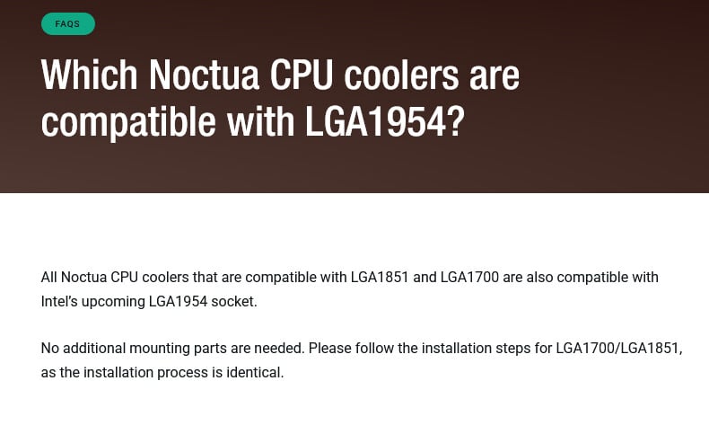 A napokban a Noctua hivatalos weboldalán olvasható GYIK (Gyakran Ismételt Kérdések) konkrétan meg is erősítette, amit a pletykák alapján már sejteni lehetett: az LGA-1954-es processzorfoglalattal gyakorlatilag a gyártó összes olyan modern processzorhűtője kompatibilis lesz, amelyek az LGA-1700-as és az LGA-1851-es processzorfoglalatra illeszkednek. A kompatibilitás biztosításához egyáltalán nem lesz szükség extra kiegészítőkre, a meglévő rögzítő keretek tökéletesen illeszkedni fognak az LGA-1954-es processzorfoglalat körül kialakított furatokhoz. Ez gyakorlatilag azt jelenti, hogy a furattávolság nem változik, illetve a processzorok magassága sem különbözik majd jelentősebb mértékben az előző generációs modellekéhez képest, így jól bevált a processzorhűtők használatát semmi sem gátolhatja.