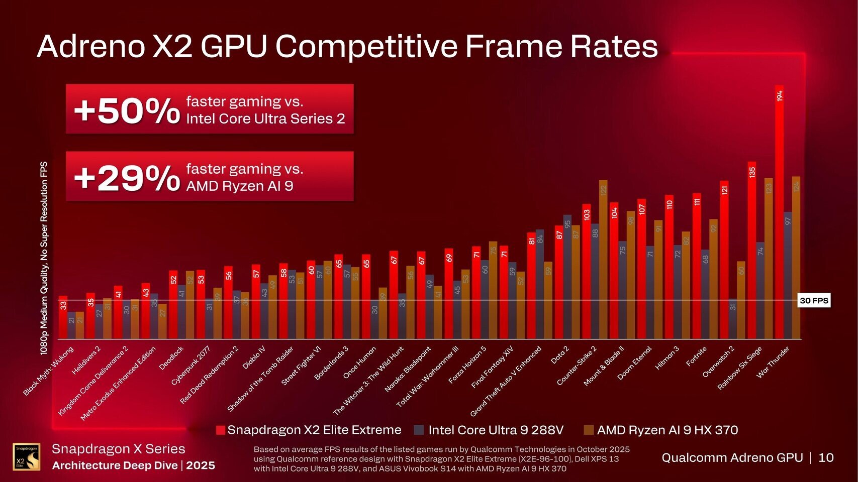 A Qualcomm belsős mérései szerint a Qualcomm Snapdragon X2 Elite SoC – ami alighanem a csúcsmodell lehetett, de pontos típusjelzést nem árultak el – az Adreno x2 iGPU révén 50%-kal gyorsabb, mint az Intel Core Ultra 9 288V típusú SoC egysége, míg az AMD RYZEN AI 9 HX 370-hez képest 29%-nyi előnyt tud felmutatni iGPU teljesítmény terén, ami nem hangzik rosszul, ha ezt a független tesztek is alátámasztják majd. Az összehasonlítás Intel-fronton egy Lunar Lake sorozatú, míg AMD-fronton egy Strix Point sorozatú SoC egységgel történt, természetesen azonos grafikai beállításokat alkalmazva.