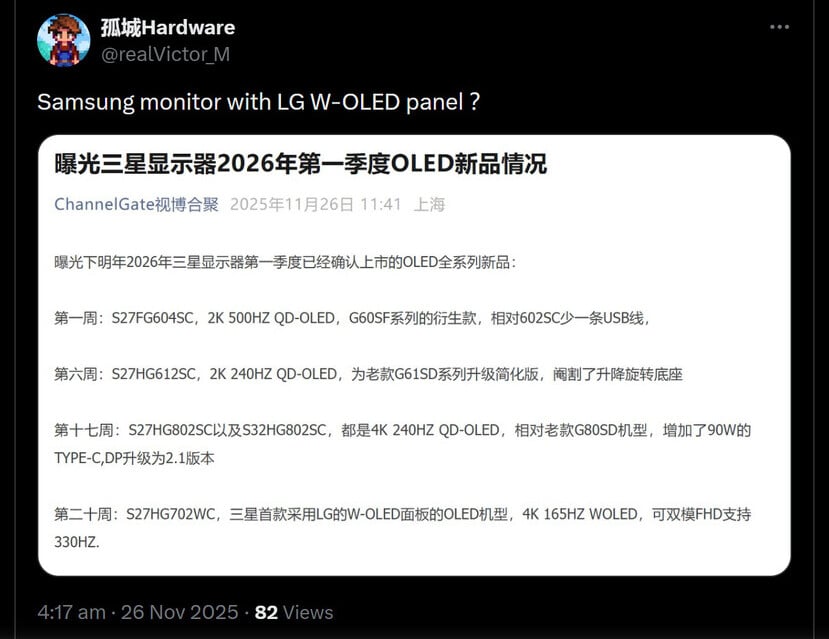 Úgy tűnik, erre már nem kell túl sokat várni, ugyanis a legfrissebb értesülések szerint legalább egy WOLED alapú Samsung gamer monitor érkezésére számíthatunk a következő év folyamán, valamikor az év közepe felé. Az iparági információk szerint az LG Display specialitásának minősülő WOLED technológiát egy Samsung S27HG702QWC termékkóddal ellátott gamer monitor alkalmazhatja elsőként, ami az ütemterv alapján a következő év 20. hetében, azaz június végén debütálhat.