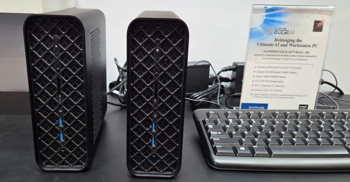 A Sapphire standján egy szokatlan Mini PC páros bukkant fel az Embedded World 2026 alkalmával, amelyek az AMD Strix Halo mobil APU sorozatának zászlóshajóját rejtették – a ComputerBase csapata figyelt fel rájuk. A RYZEN AI Max+ 395-ös mobil APU kiválóan alkalmas a különböző AI munkafolyamatok helyben, az adott PC-n történő futtatására, hála a nagy kapacitású egységes fedélzeti memóriának, ami kellő memória-sávszélességet biztosít a CPU, az iGPU, illetve az NPU számára is.