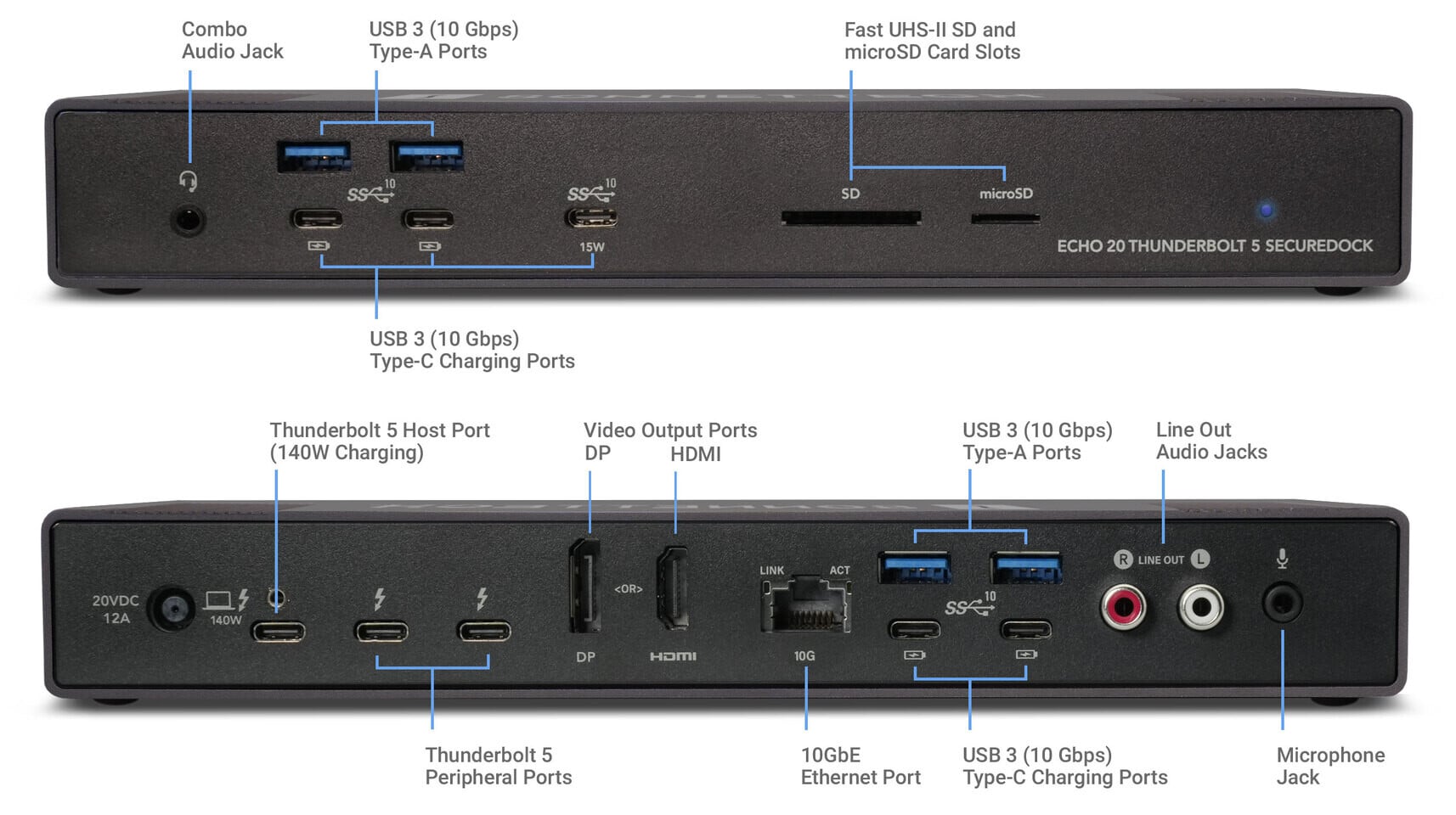 Portkínálat terén gyakorlatilag azonos az Echo 20 SecureDock és az Echo 21 SuperDock: mindkettő kapott egy fő Thunderbolt 5-ös portot, amelyen keresztül az adott noteszgéphez vagy asztali konfigurációhoz kapcsolódnak, ez a port pedig 140 W-nyi töltőteljesítmény leadására is képes, ami noteszgépek esetén kifejezetten jól jöhet. Mindkét dokkolón összesen kilenc darab USB 3.2 Gen2 port lapul, méghozzá négy darab USB-A és öt darab USB-C port formájában, valamint közös tulajdonság az is, hogy két darab Thunderbolt 5 portot kínálnak a további Thunderbolt portos eszközök csatlakoztatására. Lapul míg a kínálatban egy 10 Gigabites Ethernet port, két RCA audió kimenet, egy fejhallgató kimenet, egy mikrofon bemenet, valamint egy SD és egy microSD memóriakártya-olvasó is.