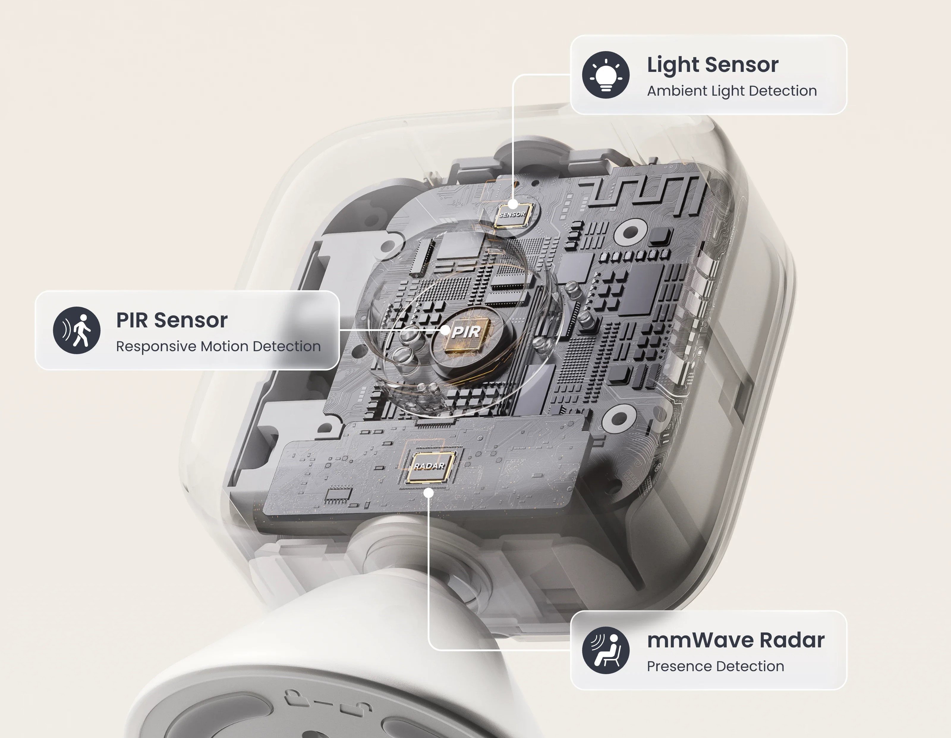 A SwitchBot Presence Sensor háromféle érzékelővel rendelkezik, így éri el a legjobb hatékonyságot és rugalmasságot. Található benne egy klasszikus PIR (passzív infravörös szenzor) mozgásérzékelő, ami nagyobb távból is képes felismerni a mozgást, és rendkívül alacsony az energiaigénye. Ezen felül van egy 60 GHz-es mmWave radar is benne, mellyel akkor is „látja” a személyeket a környezetében, ha azok nem mozognak. A sort pedig egy fényérzékelő zárja, ami filléres tétel, de érdemben növeli a lehetőségek tárházát.
