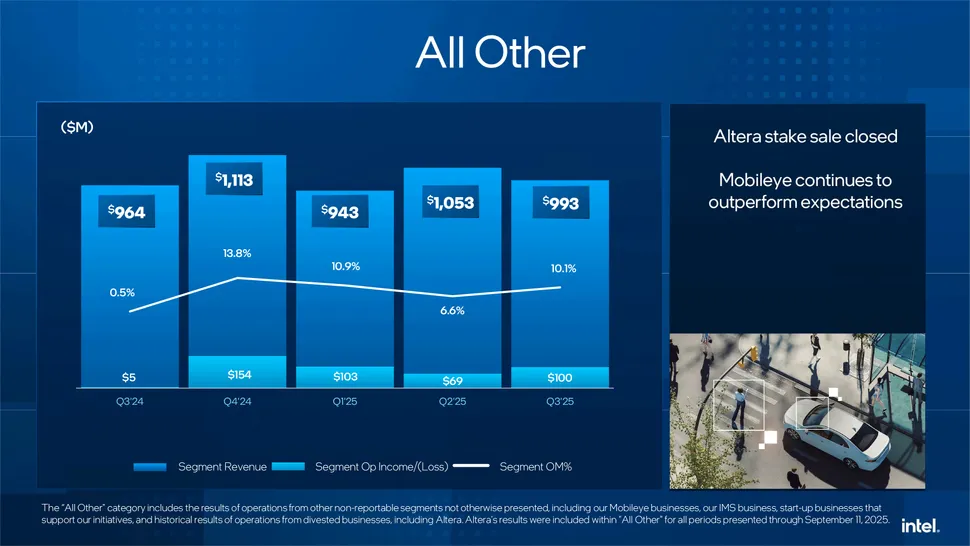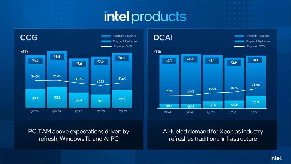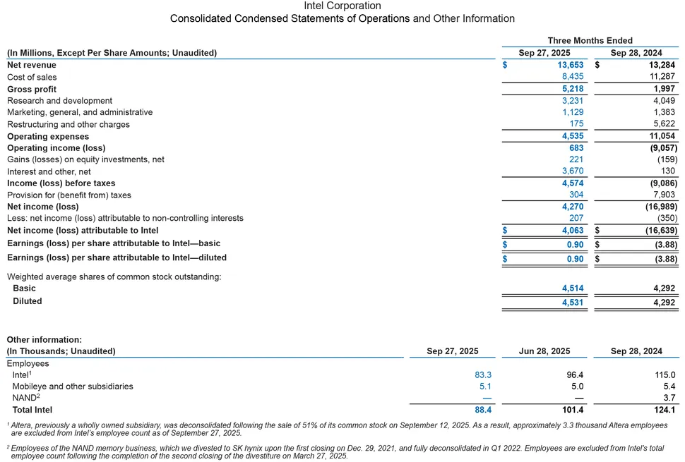 Az említett időszakban összesen 13,7 milliárd dollárnyi teljes árbevétel folyt be a vállalat kasszájába,, ami éves szinten 3%-os, negyedéves szinten pedig 6%-os növekedést takar. A pozitív eredményhez hozzájárult, hogy az amerikai kormányzat felől gyorsítva érkezik a támogatás, amit igazából befektetéssé alakítottak korábban, plusz sikerült több nagy befektetést is nyélbe ütni, hála az Nvidia és a SoftBank vezetésével kötött megállapodásoknak. Ezek együttesen azt eredményezték, hogy a profit 4,1 milliárd dollárra rúgott, azaz jelentősen felülmúlta a korábbi várakozásokat. Utóbbi lényegében abból folyt be, hogy a vállalat értékesítette Altera üzletágát és a Mobileye részesedés egy darabját is, amelyek 3 milliárd dollárt tettek ki, ezen felül további 1 milliárd dollárt is kerestek, így jött ki a 4,1 milliárd dolláros eredmény.