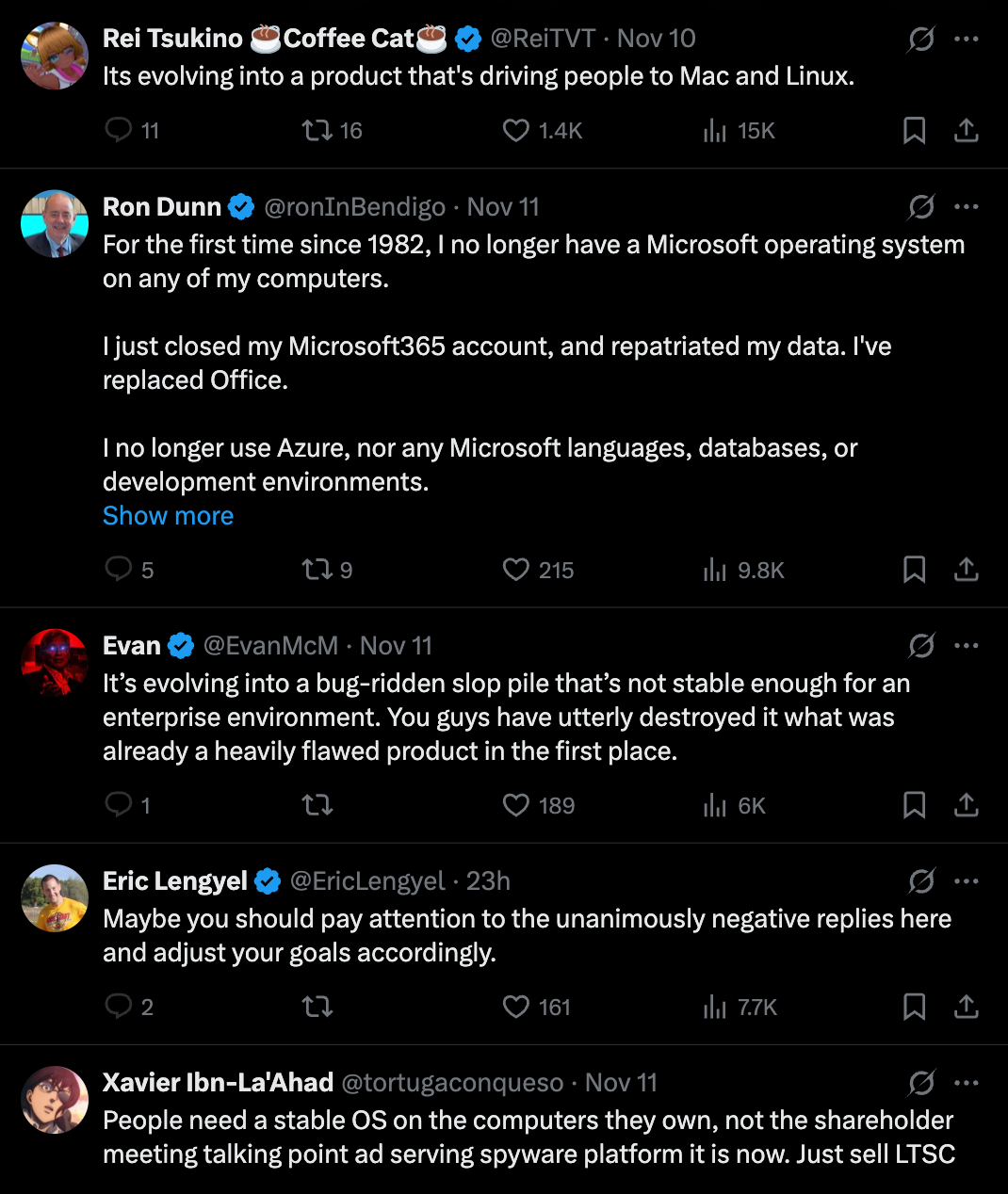 Nagy általánosságban az a bajuk a kritikát megfogalmazó felhasználóknak, hogy a Microsoft meg sem kérdezi vásárlóit, mit szeretnének, hanem kérdés nélkül megpróbálja lenyomni a torkukon a különböző AI funkciókat, akár tetszik a népnek, akár nem, miközben lényegesebb, a felhasználói produktivitást és a felhasználói élményt közvetlenül is befolyásoló dolgokkal egyszerűen nem törődnek. Azt is kritikaként fogalmazták meg a posztra válaszolók, hogy a Windows egy bughalmaz, és már nem elég stabil és megbízható ahhoz, hogy üzleti környezetben számítani lehessen rá. A stabilitással és a megbízhatósággal kapcsolatban többen is kritikát fogalmaztak meg, és sokan arról is beszámoltak, hogy vagy alternatív operációs rendszer váltásán gondolkodnak, vagy már váltottak is és nem néznek vissza.