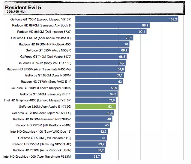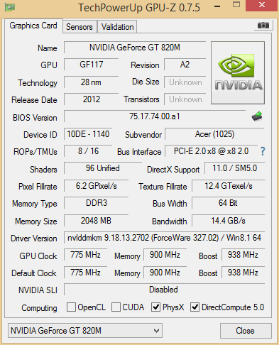 Az új nagyképernyős Aspire E1 alap kiépítésben tartalmaz egy processzorba integrált videokártyát, amely minden esetben az Intel HD Graphics 4600-as VGA-ját jelenti. Bár már ismerjük és tudjuk, mire képes, a pár hónappal ezelőtt bekerült új játékokkal is megvizsgáltuk, de erről majd később. A hazánkban kapható legtöbb modellben találni fogunk viszont egy dedikált 3D gyorsítót is, amely a GeForce 820M névre hallgat. Bár a név, pontosabban a számozás alapján felcsillanhat a szemünk, gyorsan helyére kell tennünk a dolgokat: ez egy nagyon régi videokártya másodszorra is újracsomagolva. Ahogy már a megjelenésekor is beszámoltunk róla, a Fermi architektúrára épülő megoldás 96 CUDA magot tartalmaz, ezek 64 bites adatsínen keresztül férnek hozzá a 2 GB GDDR3 memóriához. Az NVIDIA által ajánlott 775/1550/1800 MHz-es órajeleken az Acer mérnökei nem változtattak, amit jól tettek, ugyanis a gépet csúcsra járatva nem csak a processzor, de a videokártya is 90 fok körül üzemelt.
