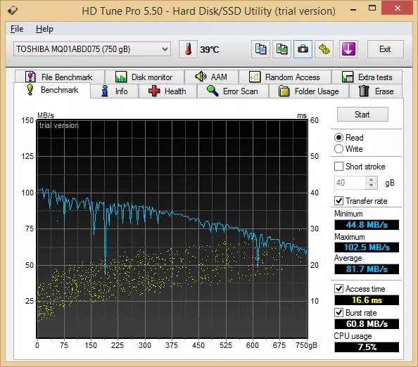 Akárcsak a processzor, a merevlemez is megegyezett azzal a példánnyal, amivel előző tesztnotebookoknál találkozhattunk. A 750 GB-os Toshiba merevlemez nem meglepő módon azóta se gyorsult be, hűvösebb sem lett, viszont valahogy az Acer E1-ben mintha halkabb lett volna (vagy csak elnyomta a hűtés zaja, bár ez kevésbé valószínű).