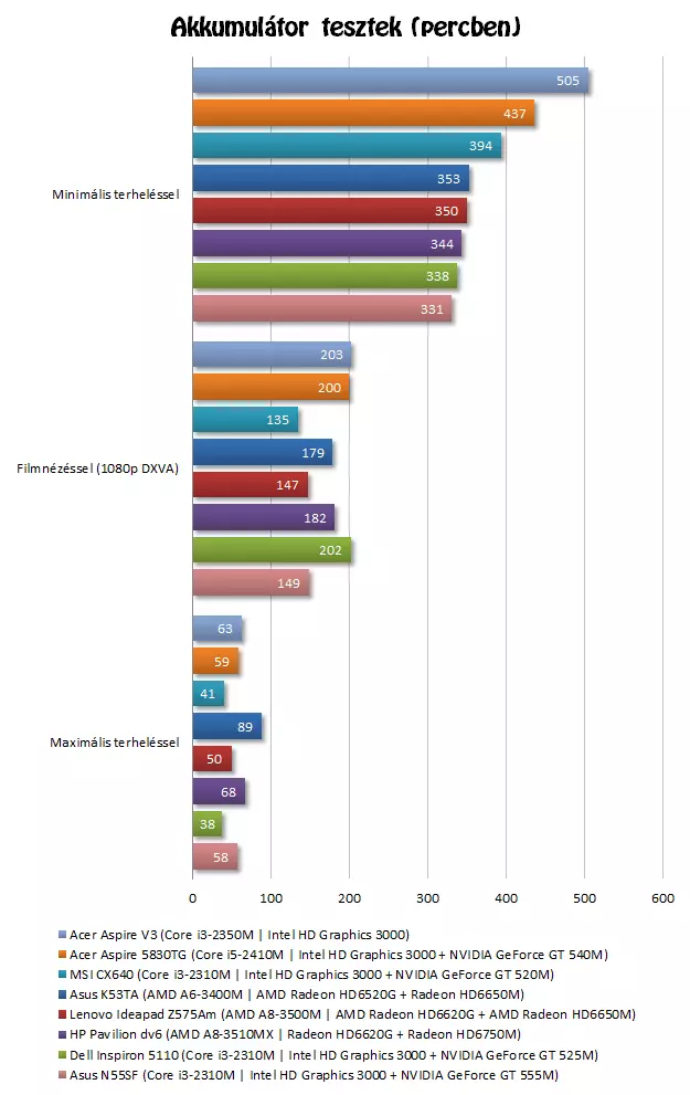 Furcsa módon a V3 szinte ugyanaddig bírta szuflával, mint a nagyobb kapacitású akkumulátorral rendelkező 5830TG, pedig az első két teszt esetében mindkettőnél az integrált videokártyát használtuk. Ez mindenképpen az újoncnak dicsőség, a bő 8 órás olvasós teszt egyértelműen jó eredménynek tekinthető, kár, hogy a legnagyobb terhelés mellett szinte semmivel nem bírja tovább, mint a jóval erősebb TimelineX. Ez előre vetíti a GT 630M-es változat szereplését is, amely valószínűleg bő háromnegyed óra után feladja a harcot, ha minden porcikáját munkára bírjuk.