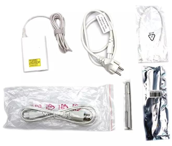 Az apróságokat a fenti képen láthatjuk: egy nagyobbacska adapter, két különböző dugasszal, a korábban már látott kissé idétlen rugós tappancs végű stylus, valamint egy microHDMI-t VGA-ra konvertáló átalakító kerül elő. Ezen felül kapunk egy microUSB – USB adaptert, amelyet valószínűleg a Bluetooth billentyűzet töltésére használhatunk, ugyanis ilyen port nincsen a készüléken. Az egyik rejtett zugból előkerül egy törlőkendő, amelynek nagyon örülhetünk, hiszen a gyönyörű kijelző szinte vonzza az ujjlenyomatokat.