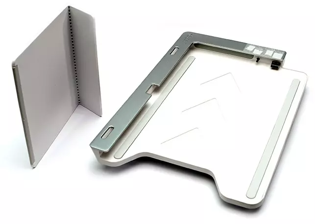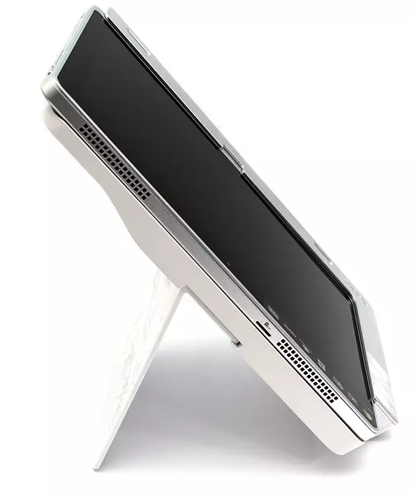 A fenti ábrán is látható, hogy a mérnökök egy szemfüles megoldással lehetővé tették, hogy a táblagépet egy adott szögben meg tudjuk támasztani, ezáltal aránylag kellemes gépelési élményt tudunk elérni. A billentyűzet fémből készült, minőségi darab, a helytakarékosság miatt azonban a gombok túlságosan laposak, rövid úton járnak, ettől függetlenül hosszabb szövegek bevitelére megfelelően használható ez a kiegészítő.