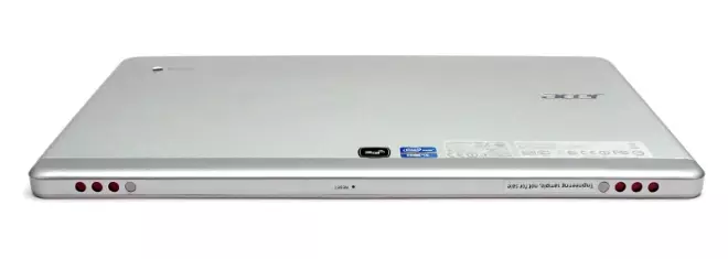 A hátlapot itt is kellemes tapintású fém borítja, az illesztéseket nem érheti panasz, nyekergést nem tapasztaltunk. Az egyhangúságot balra a segédfény nélküli kamera, jobbra pedig a bemart acer felirat töri meg. Alul jó szokás szerint a matricák sorakoznak.