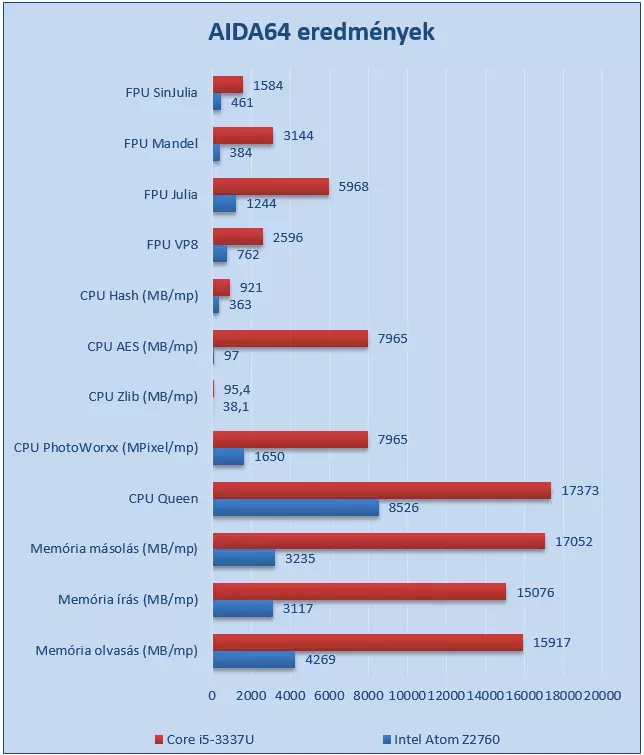 A teszteléshez most is az AIDA64 Extreme Edition 2.80.2300-as változatát használtuk, és a legutóbb tesztelt W510 Atom Z2760-asával vetettük össze a kapott pontszámokat, hogy lássuk mekkora előrelépés egy ilyen processzorral szerelt tablet az Atomoshoz képest.