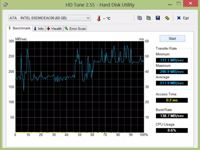 A HD Tune tesztje, bár ismét alacsonyabb eredményeket mutat, de azért jól jelzi, milyen képességű adattárolót szereltek az Acer mérnökei ebbe a táblagépbe.