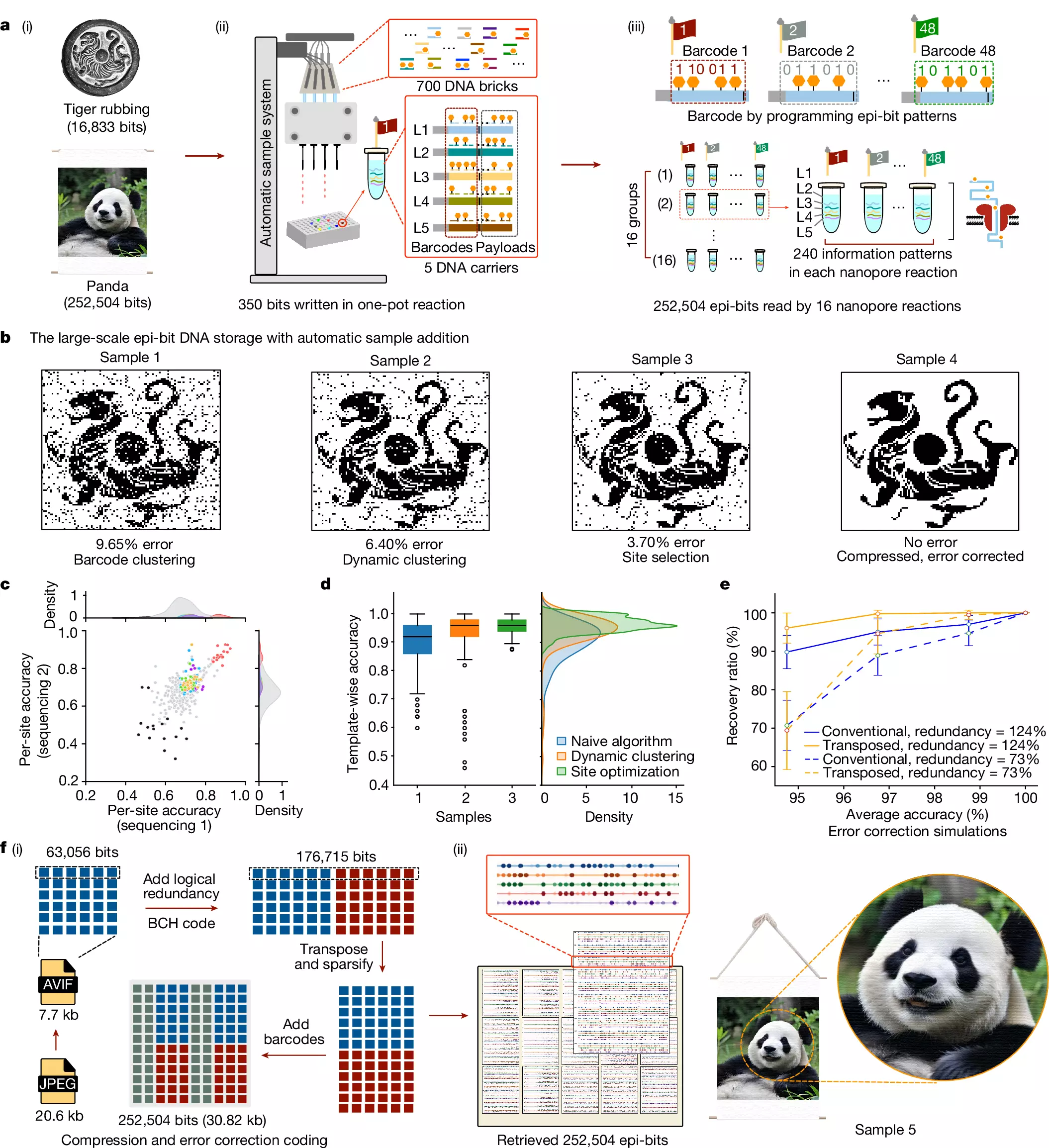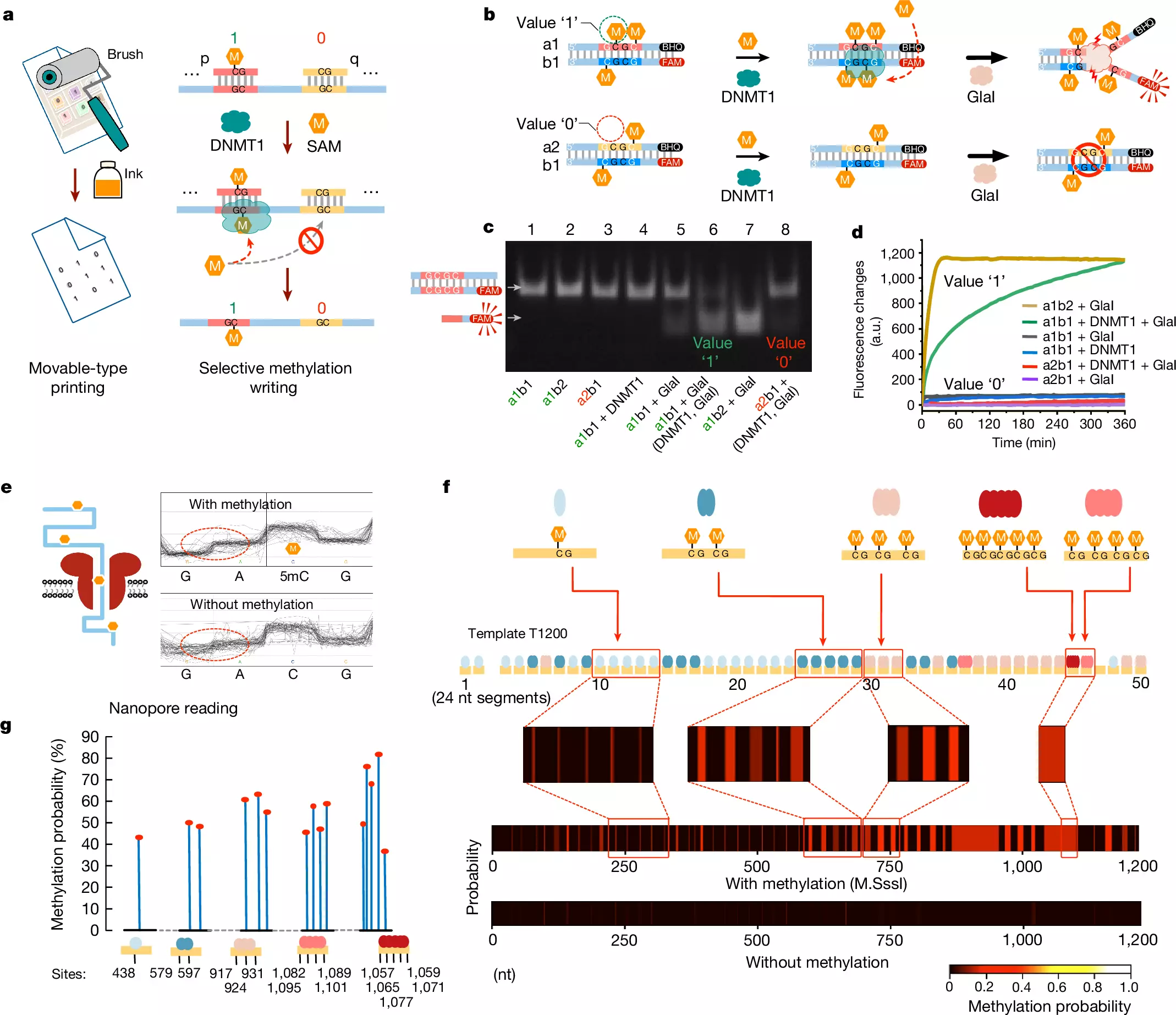 Végül a kutatók „tintát” vittek fel a „betűkre”, hogy elvégezzék a nyomtatást. Hozzáadtak az oldathoz egy metiltranszferáz névű enzimet, amely a legókon lévő összes metilcsoportot átmásolta a sablonszál szomszédos helyére, amelyet aztán egy kereskedelmi forgalomban kapható DNS-szekvenáló gép le tudott olvasni. A módszerrel közel 270 ezer bitet tartalmazó fájlok írását és olvasását demonstrálták, ami elég ahhoz, hogy nagy felbontású képeket, például egy tigrist és egy óriáspandát kódoljanak.