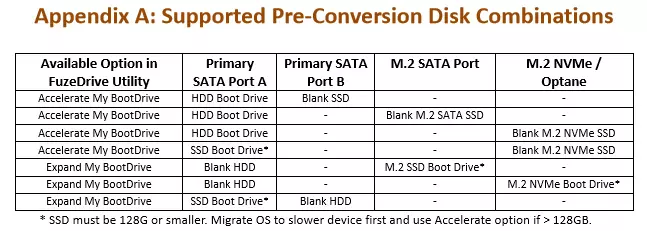 Gyors meghajtóként SATA vagy NVMe alapú kiskapacitású SSD jöhet szóba, ami akár Optane sorozatú, 3DXpoint technológia köré épülő gyorsítótár meghajtó is lehet. Az alaplicenc esetében a rendelkezésre álló SSD tárhelyből csak 128 GB-nyit használ a FuzeDrive, a többi tárhely külön partícióként használható fel – a plus licenc esetében már 1 TB az SSD limit.