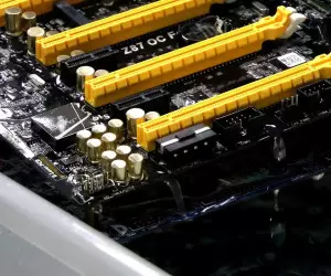 A tesztben az alaplapon víz folyt végig, méghozzá úgy, hogy a rendszer eközben működött. A technológia remekül helytállt, viszont nem véletlen, hogy az alaplap egy bizonyos szögben megdöntve foglalt helyet az állványon. A speciális réteg csak a nyomtatott áramköri lapot védi, azaz akkor, ha a szabadon lévő csatlakozók érintkezőit víz éri, az továbbra is kárt okozhat az alaplapban, ugyanis zárlat következhet be. Ez valószínűleg sokak számára egyértelmű, de vannak, akiknek nem, így mindenképpen ki kell emelni, és éppen ezért az ASRock sem titkolja, hogy ez így van.