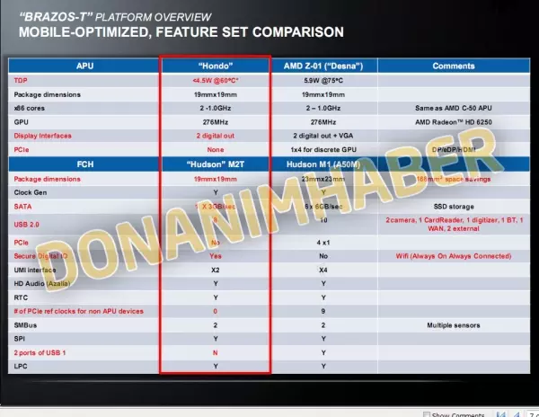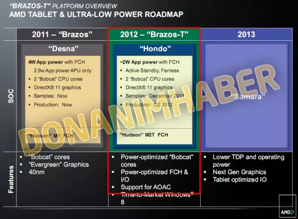 A Brazos-T platform egyébként két fő komponensből épül fel: az egyik a Hondo kódnévre keresztelt APU egység, amely a Desna (Z-01) utódjául szolgál majd, míg a másik a Hudson M2T lapkakészlet, ami a Hudson M1 FCH (Fusion Controller Hub) helyét veszi át a piacon.