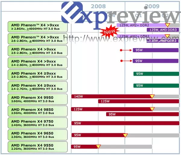 Érdekesség, hogy a táblázatban 95W-os TDP-vel ellátott Phenom processzorok is szerepelnek (két zöld csík), amelyek a 2009-es év első negyedévében jelennek meg. Ez utóbbi egységekről egyelőre nincsenek pontos információk, de az sejthető, hogy a processzorok AM2+-os foglalatba illeszkednek majd és DDR2-es memóriavezérlővel lesznek felszerelve.