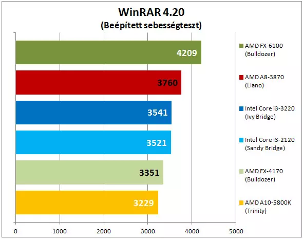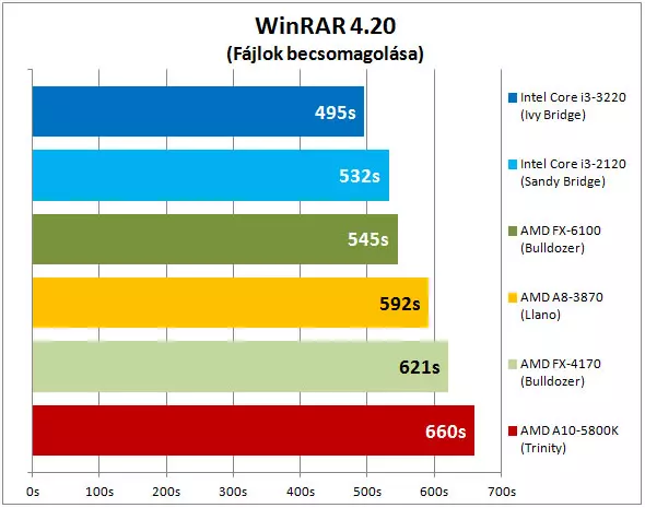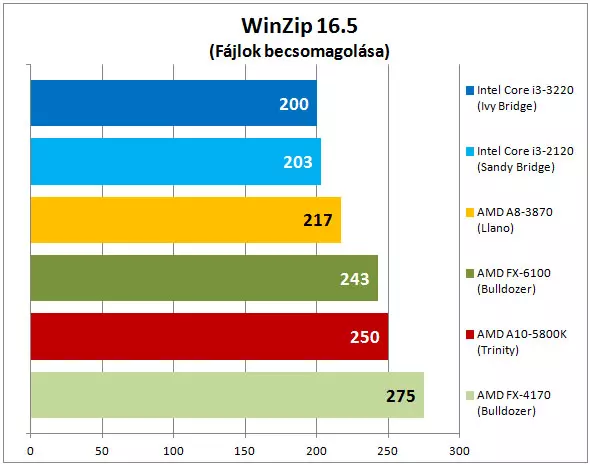 A WinZip teszt alkalmával a Piledriver alapú Trinity a Bulldozer alapú FX-4170 elé kerül, méghozzá látványosan, sőt, az FX-6100-tól sincs túlságosan lemaradva. Az Ivy Bridge és Sandy Bridge processzorok között mindössze 3 másodpercnyi különbség mutatkozott, de attól még az előny az új architektúráé.