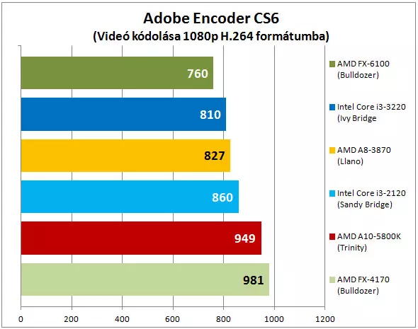 Az Adobe Media Encoder végre kiaknázza a több processzormagban rejlő lehetőséget, ami meg is látszik az eredményeken: az FX-6100 végre elfoglalhatta méltó helyét. A Trinity APU is az FX-4170 elé kerül, és ugyanez a helyzet a Sandy Bridge -  Ivy Bridge párharcban is.