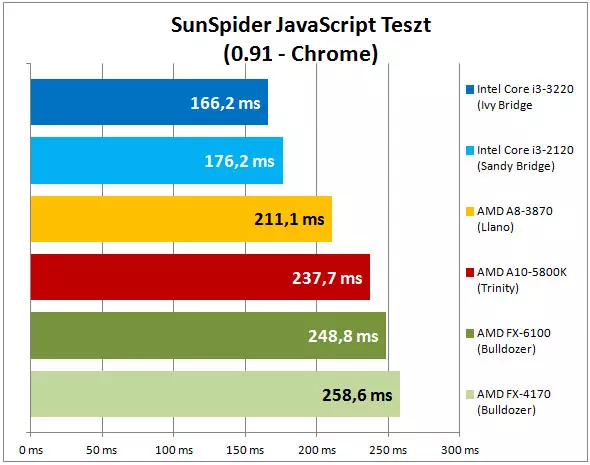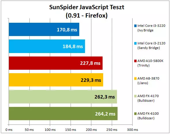 A Firefox alatt futó teszt alkalmával a sorrend nem változott, viszont a Trinity itt már a Llano APU-t is megelőzte. A Sandy Bridge - Ivy Bridge párharc eredménye ugyancsak változatlan.