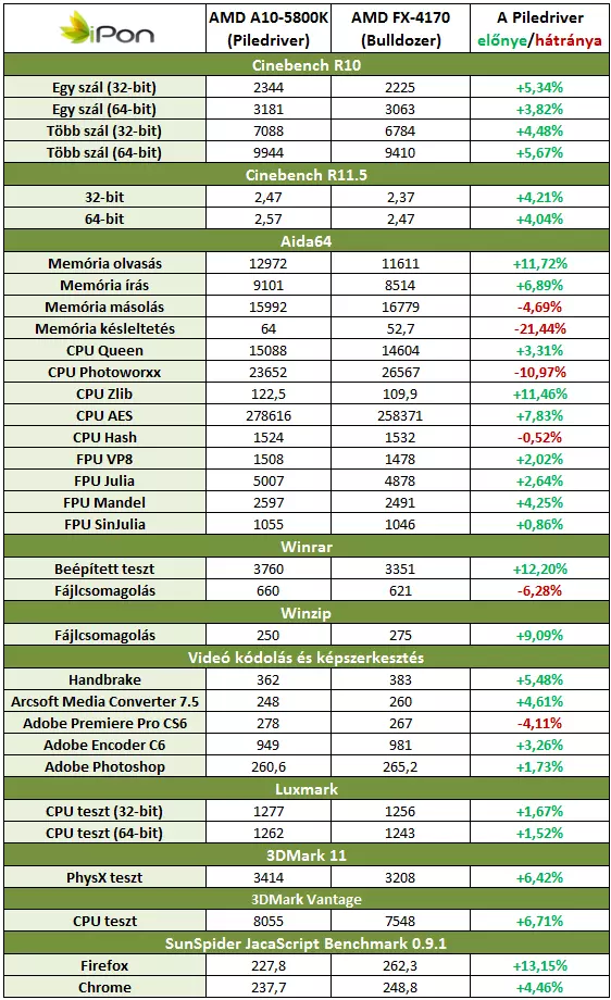A könnyebb összehasonlíthatóság érdekében tesztünk ide vonatkozó eredményeit táblázatban összesítettük, így remekül lászik az A10-5800K és az FX-4170 közötti teljesítménykülönbség.