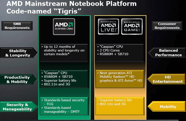 Az első két chip Conesus és Caspian kódnevekre hallgat, mindkét termék jövőre kerül piacra. A processzorok két maggal és DDR2-es memóriatámogatással lesznek ellátva, előbbit (Conesus) a Yukon platform társaságában főként az ultra-hordozható noteszgépekbe (UMPC), míg utóbbit a Tigris platformmal karöltve a mini notebookokba szánja őket a vállalat.  Mindkét termék 2009 második felében kerül piacra.