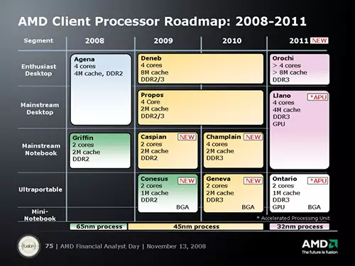 Az AMD jelenlegi elképzelései szerint a gyorsított feldolgozó egységek, azaz a CPU-GPU hibridek 32 nm-es csíkszélességgel fognak elkészülni, így optimális teljesítmény/watt arányt tudnak nyújtani. Ezzel együtt a gyártó négy új mobil processzort is tervez majd.