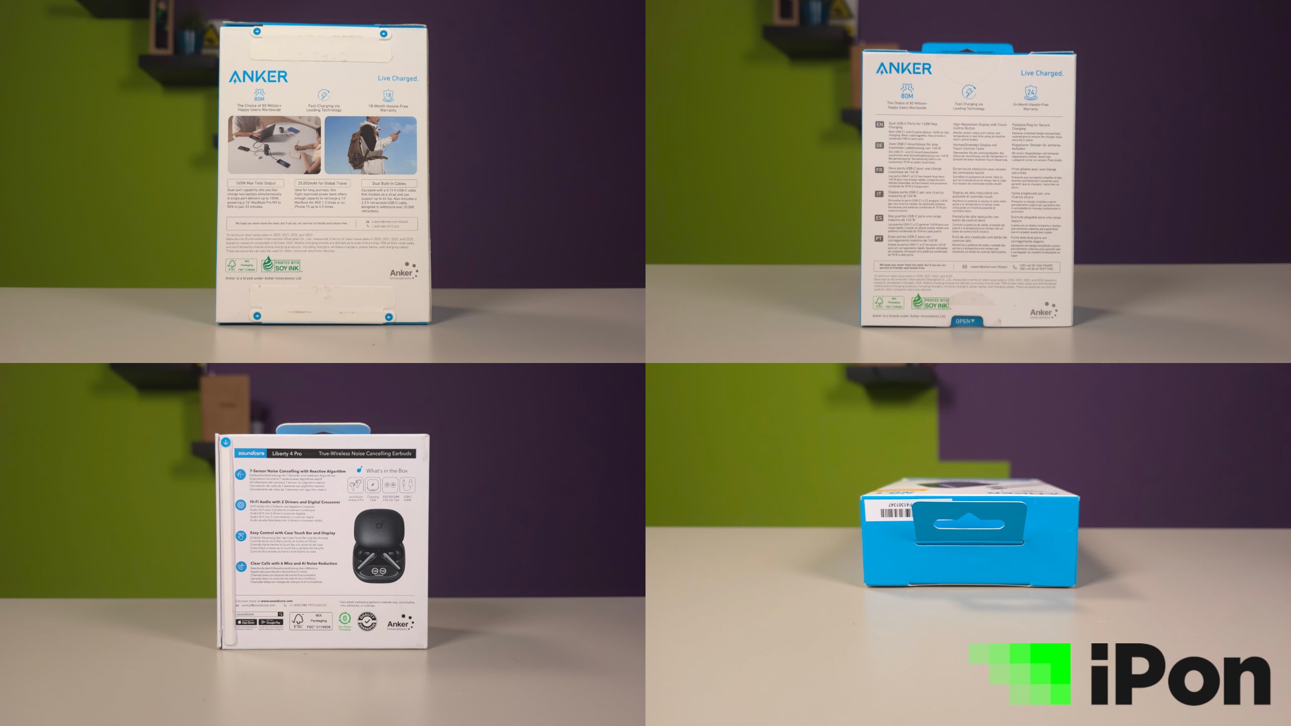 Cserébe gyorsan és sok mindent megtudhatunk a termékekről, legyen szó a töltők esetében extrának számító színes kijelzőkről, vagy akár a fülhallgató várható üzemidejéről és a zajkioltáshoz használt belső mikrofonok számáról. A csomagolás amúgy jó minőségű, a feliratok is jól olvashatók,a képek részletei jól kivehetők. Ebből az is látható, hogy az ANKER is egy, azon kínai cégek közül, akik világszínvonalra törekednek és fontos számukra a nemzetközi jelenlét és elismertség.